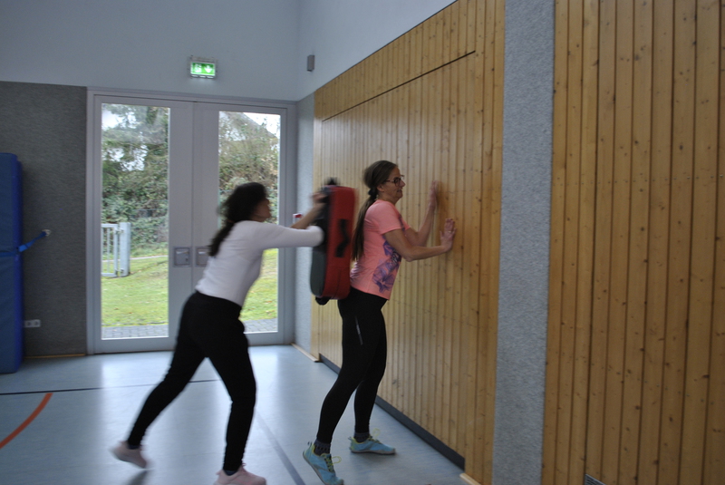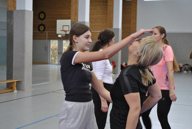 Wie immer fand in der ersten Trainingseinheit eine Wiederholung des bereits Erlernten statt. Die richtige Körpersprache und der Einsatz der Stimme schrecken schon 30 Prozent der Täter bei der Opferauswahl ab.