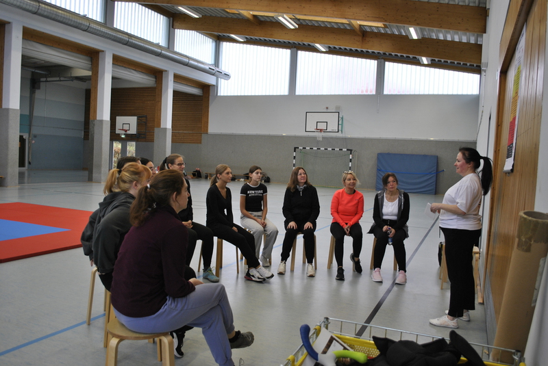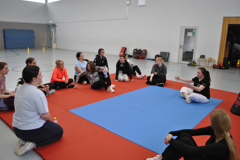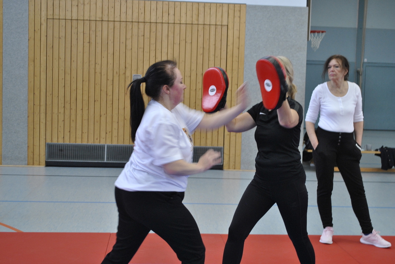 Nach einer kurzen Aufwärmphase erhielten die Teilnehmerinnen eine Anleitung, wie sie kraftvoll schlagen und treten können, ohne sich selbst zu verletzen, sowie wie sie ihren Kopf vor Schaden schützen. Im Verlauf der zweiten Trainingsstunde wurde den Frauen bewusst gemacht, wie sie ihre Umgebung zu jeder Zeit und an jedem Ort entspannt wahrnehmen können, ohne dabei an Aufmerksamkeit einzubüßen. Mit klarer Körpersprache und einer lauten, festen Stimme eine unsichtbare Mauer errichten – dem möglichen Angreifer unmissverständlich zu zeigen, dass hier Schluss ist, war ein weiterer spannender Teil des Trainings. Entscheidungen zu treffen, ob man flüchtet oder sich verteidigt, rundeten die zweite Trainingsstunde ab. In der dritten Stunde ging es dann um das aktive Handeln – sich mit allen zur Verfügung stehenden Mitteln sich zu verteidigen. Hier kamen auch alltägliche Gegenstände wie Smartphones, Handtaschen, Stifte, Zeitungen u.a. Gegenstände zum Einsatz.