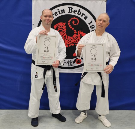 So traten beide gut vorbereitet, jedoch mit gebührendem Respekt und einer erheblichen Anspannung, zur Prüfung an, in der sie die Prüfungsteile Kihon, Kata, Katabunkai sowie straßenbezogene Selbstverteidigung zu bestehen hatten. Nach drei Stunden harter Prüfung strahlten die beiden erleichtert, als sie endlich ihre DAN-Urkunden aus den Händen von Prüfer Michael Lechte, 8. DAN und Lutz Fischer, 6. DAN entgegennahmen.