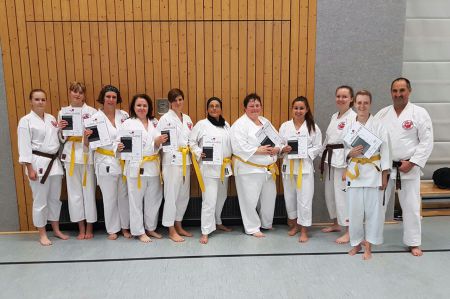 Dieses Jahr führten wir erstmals einen Karateanfängerkurs nur für Frauen durch. Im März fanden sich zehn Frauen im Alter von 12 bis 50 Jahren zum ersten Training in der Halle am Bünberg ein. Unter der Leitung von Miriam Wacker und Michelle Meister (beide besitzen die Trainer-C-Lizenz) wurden die Frauen nach und nach an das ungewohnte Training herangeführt. Sie lernten Karategrundtechniken, Schattenkampf und Selbstverteidigung. Zur Stärkung des Selbstvertrauens wurde Selbstbehauptung unterrichtet und selbst einen Bruchtest absolvierten die Frauen erfolgreich. Ende September stellten sich acht von Ihnen der Prüfung zum Gelben Gürtel und bestanden diese mit Bravur. Das Ergebnis hat den Verein darin bestärkt, diesen Weg weiterzugehen und so wird auch im nächsten Jahr wieder ein Anfängerkurs nur für Frauen und Mädchen angeboten werden.