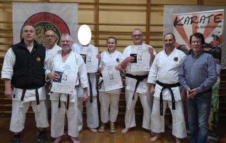 Am ersten Adventwochenende stellten sich zwei unserer Karateka der Prüfung zum 1. DAN (Schwarzer Gürtel). Nach jahrelangem Training und intensiver Vorbereitung durch ihre Trainer im letzten halben Jahr im Shotokan- und Stiloffenen Karate (SOK) konnten Christian Klatt und Michelle Meister die Urkunden aus den Händen der Prüfer Mark Haubold, 5. DAN, Bernd Schäfer, 6. DAN und Michael Lechte, 6. DAN entgegennehmen. Die drei Prüfer lobten die „überdurchschnittlichen Leistungen“ aller Prüflinge. Gemeinsam mit den Dreien, stellte sich Sensei Dieter Jung vom Budokan Bad Hersfeld seiner Prüfung zum 3. DAN. Der 71-jährige hatte sich in den letzten zwei Monaten sehr intensiv (fünf bis sechs maliges Training wöchentlich) in Bebra und beim Budokan Göttingen vorbereitet. Geschafft und glücklich nahm er 43 Jahre nach seiner letzten Prüfung im Karate die Urkunde zum 3. DAN entgegen. Zu erwähnen ist, dass unsere beiden Trainer Jürgen Dach und Jürgen Wacker (beide 3. DAN) die Sensei Jung auf seinem Weg zur Prüfung begleiteten, einst unter ihm die ersten Schritte im Karate lernen durften.