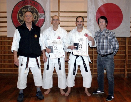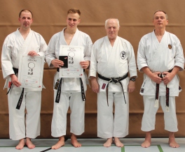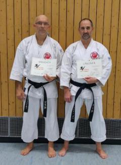 Unsere „beiden Alten“ haben es wieder geschafft. Jürgen Dach und Jürgen Wacker sind nach monatelanger und intensiver Vorbereitung seit dem 26. November 2016 stolze Träger des 3. DAN im Karate. Sie überzeugten die Prüfer Bernd Schäfer und Michael Lechte (beide 6. DAN) insbesondere mit einer starken Leistung in ihren Prüfungskatas „Bassai Sho“ und „Gojushiho Dai“. Zum Heimspiel wurde für die Beiden der Prüfungsteil Selbstverteidigung. So wurden sie mit allen Szenarien des Straßenkampfes, einschl. der Angriffe mit Stock und Messer, durch zwei Angreifer konfrontiert. Beide konnten die zeitverzugslosen Angriffe jederzeit kontrollieren und so waren nicht nur die Prüfer, sondern auch die anderen DAN-Prüflinge von der starken Vorstellung der beiden beeindruckt.
