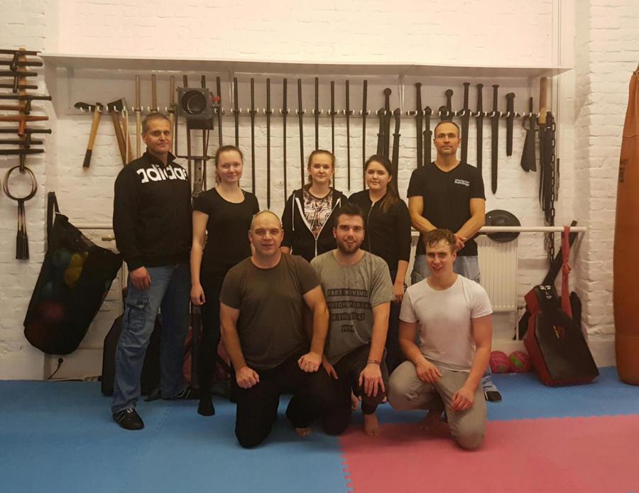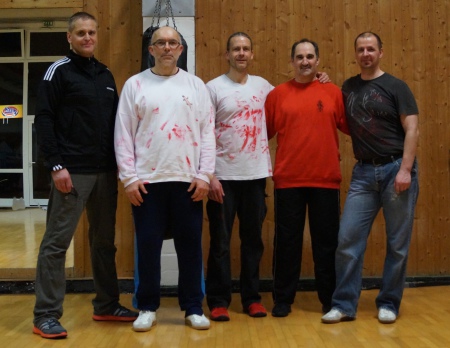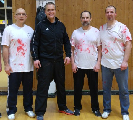 Drei von uns folgten der Einladung von DKV-Ausbilder Sven Burkard zu einem limitierten Selbstverteidigungsseminar der Extra-Klasse und so trafen sich insgesamt 20 Kampfsportler aus ganz Deutschland in Svens Dojo in Emden. Das Seminar stand unter dem Motto: „Selbstverteidigung beim Angriff mit gefährlichen Gegenständen“. Ausbildungsleiter war Jürgen Kestner, Selbstverteidigungsausbilder des Deutschen Karate Verbandes. Aus seinem enormen Erfahrungsschatz schöpfend, führte er die Seminarteilnehmer in acht Stunden in immer fordernden Übungseinheiten ans körperliche und auch mentale Limit. Immer wieder machte er uns klar, dass es sich bei dieser Art von Selbstverteidigung nur um „Schadensbegrenzung“ handeln kann und eine realistische Selbstverteidigung ohne Blessuren hierbei nicht möglich ist. Alle konnten wir es dann auch am eigenen Körper erfahren und (durch die mit roter Farbe eingepinselten Gegenstände) sehen, wie das Foto oben eindrücklich zeigt. Der Lehrgang endete mit einem gemeinsamen Abendessen in einem örtlichen Restaurant. Alle waren einig, sich auch im nächsten Jahr wieder zu einem Seminar mit Sven Burkard und Jürgen Kestner in Emden zu treffen.
