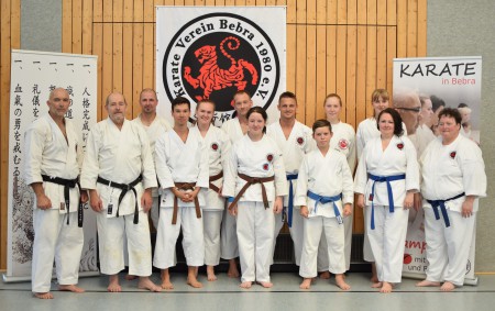 In der ersten Ferienwoche führten wir unsere Sommerprüfung durch. Dreizehn Karateka des Vereins im Alter von 8 bis 52 Jahren traten zur anspruchsvollen Prüfung im Koshinkan-Karate-Do an. Im Koshinkan-Karate wird schon vom ersten Übungstag an Wert auf die Umsetzung der erlernden Techniken in der straßenbezogenen Selbstverteidigung gelegt. Effektivität der Techniken geht vor Schönheit. Daher wurden alle Prüflinge in den Prüfungsthemen Kihon (Grundschule), Kata (Formenlauf), Kata-Bunkai (Anwendung der Kata in der Selbstverteidigung), Kumite (Kampf) und Selbstverteidigung geprüft. Nach drei harten und fordernden Stunden nahmen die erschöpften aber glücklichen Prüflinge ihre Urkunden und die neuen Gürtel aus den Händen der beiden Prüfer Jürgen Dach und Jürgen Wacker (beide 3. DAN) entgegen.Das Bild zeigt von links nach rechts: Marius Gustavus, Wilfried Zuschlag (2. Kyu), Mirko Panitz (2. Kyu), Tatjana Peters (7. Kyu),Zoe Fieber (3. Kyu), Marc Kevin Gerth (7. Kyu),Leo Barwich (4. Kyu), Timo Röthig (4. Kyu), Nica Barwich (6. Kyu), Tatjana Bar