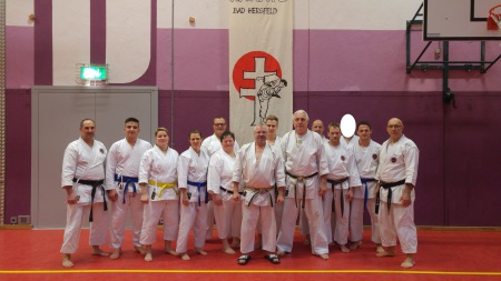 Am 2. Februar besuchten wir einen Selbstverteidigungslehrgang zum 50-jährigen Jubiläum von Sensei Dieter Jung in Bad Hersfeld. Dieter hatte als Referenten Shihan Sigi Wolf, 9. DAN gewonnen. Gemeinsam mit fast 90 anderen Mitstreitern übten wir fleißig die Techniken, die uns Shihan Wolf in drei Trainingseinheiten zeigte. Shihan Wolf kam es besonders darauf an, dass alle Karatetechniken, die er uns zeigte, für den Straßenkampf geeignet sind. So mussten einige, auch höher graduierte Karateka feststellen, dass in der Grundschule geübte Blöcke in der Selbstverteidigung Angriffe sind und das man grundsätzlich bei einem Angriff die Distanz verringert und nur aus taktischen Gründen, wie einer Finte, zurückweicht.