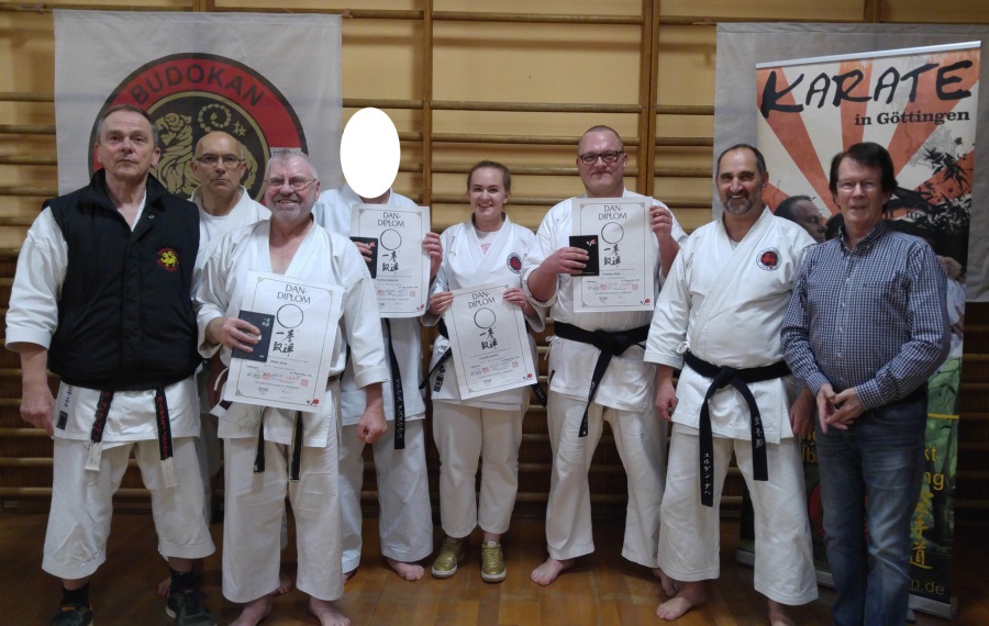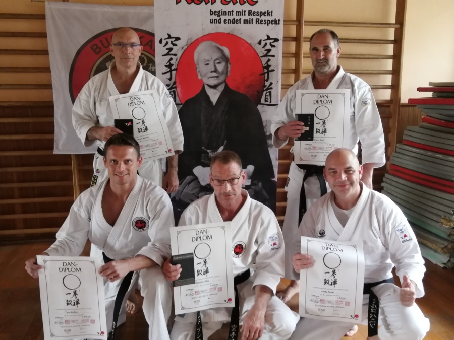Obwohl Corona die angesetzte Prüfung zwei Mal verhinderte, stellten sich am 10. Juli gut vorbereitet, drei von uns in Göttingen der Prüfung zum 1. DAN (schwarzer Gürtel). Unter den Augen von Großmeister Michael Lechte, 7. DAN und Sensei Bernd Schäfer, 6. DAN mussten sie die, in vielen Jahren, erlernten Fähigkeiten demonstrieren. Geprüft wurden sie in Grundschule (Kihon), Formenlauf (Kata), der Anwendung der Kata (Kata-Bunkai) sowie in der Selbstverteidigung. Unsere beiden "ALTEN" folgten ihnen und legten die Prüfung zum 4. DAN ab. Nach drei anstrengenden Stunden, in denen alle Fünf sehr gute Leistungen zeigten, durften sie die Urkunden aus den Händen der beiden Prüfer empfangen!