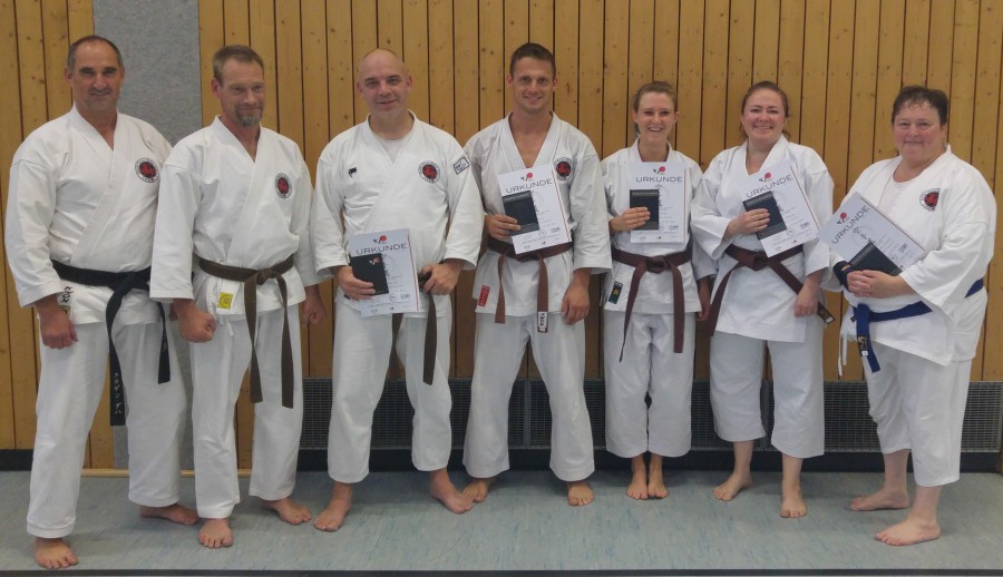 Besonders hob Prüfer Wacker die Leistungen von Timo Röthig hervor, der seinen ersten braunen Gürtel erwarb. In seiner 50 minütigen Prüfung musste er nicht nur Kihon (Grundschule), Kumite (Kampf)und Kata (Formenlauf) zeigen, sondern auch die Techniken der Kata in der Anwendung erklären. Zusätzlich wurde ihm noch ein komplexes Selbstverteidigungsprogramm auferlegt. Alle Aufgaben meisterte er mit Bravour.